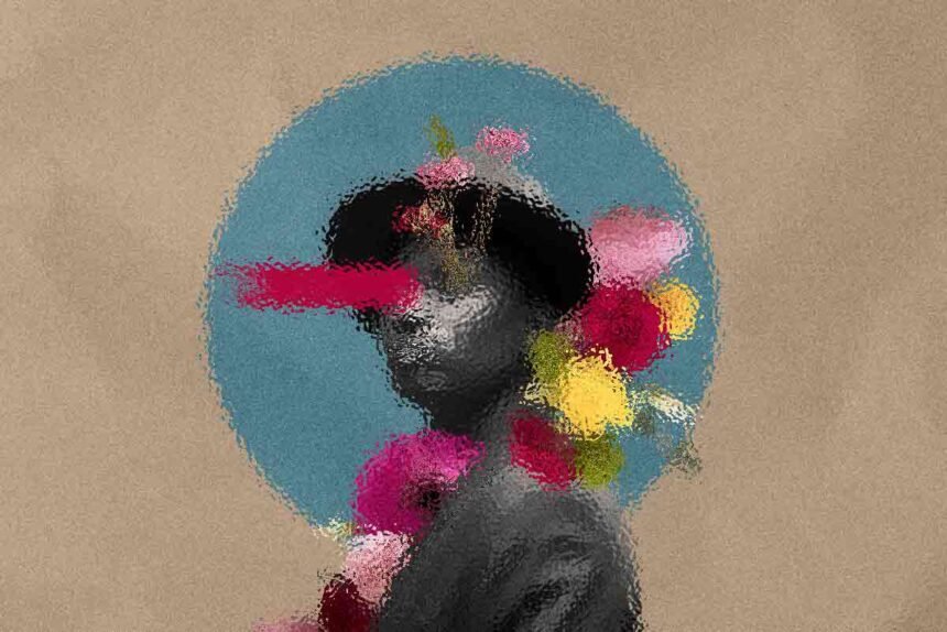 Abstract art, collage with female portrait and mountains, generative ai