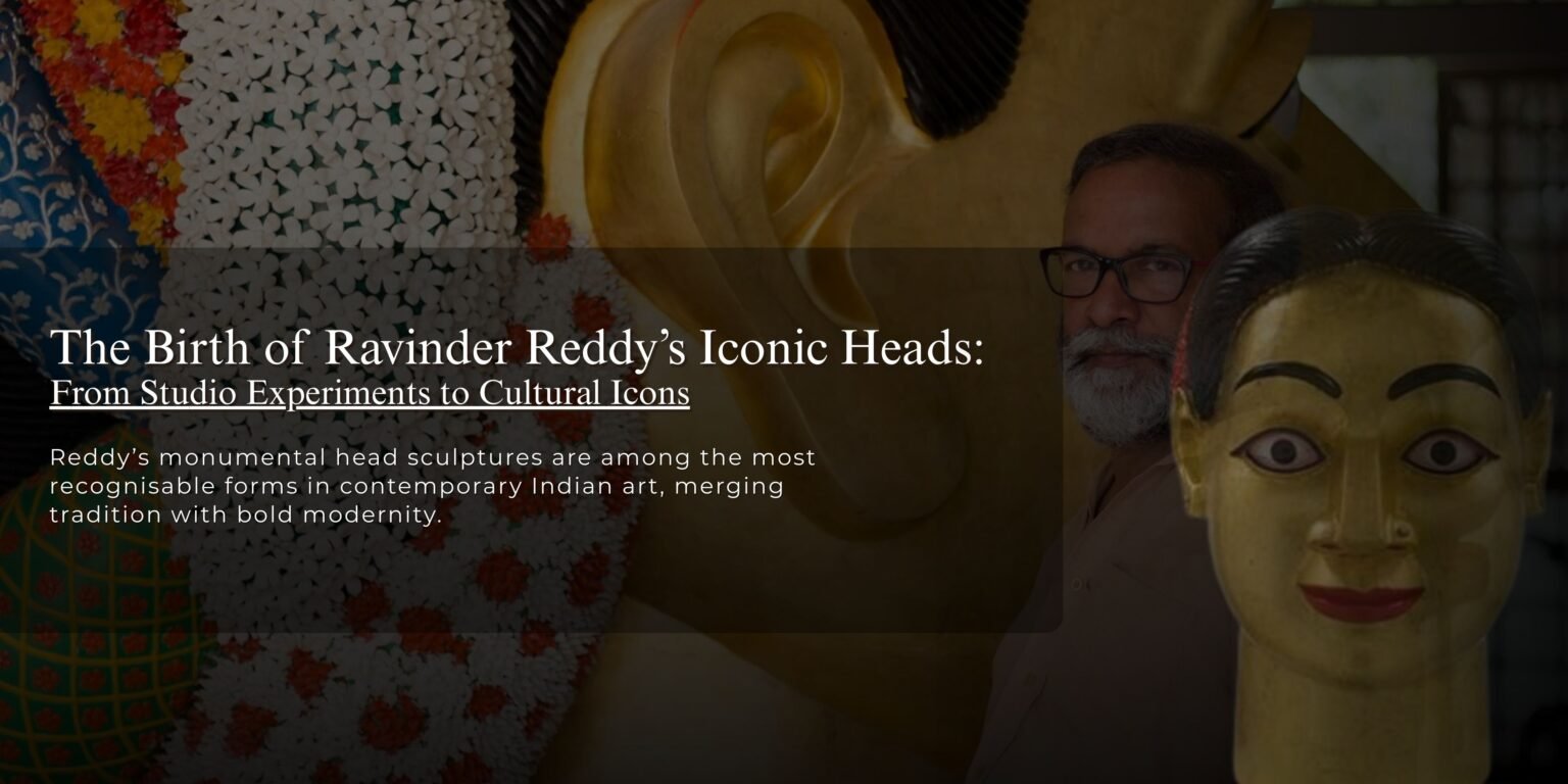 In the tapestry of contemporary Indian art, few works have achieved the enduring resonance and symbolic density of G. Ravinder Reddy’s monumental head sculptures. These towering visages, gilded, vividly coloured, and arresting in their frontal gaze, stand as some of the most recognisable artistic achievements of the late 20th and early 21st centuries. Once nascent studio explorations, they now inhabit the living spaces of premier collectors and public galleries alike, forming a defining axis in the narrative of Indian contemporary sculpture.