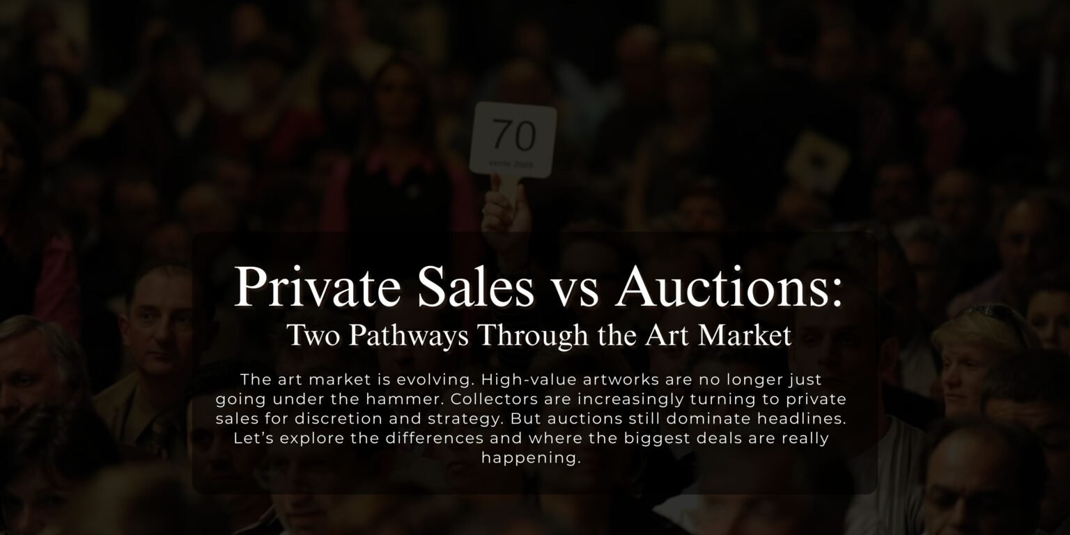 Private sales and auctions represent two distinct yet interdependent structures within the art market. Auctions generate public benchmarks, establishing visible records of value through competitive bidding. Private sales, by contrast, offer discretion, flexibility, and personalised negotiation within curated networks of collectors and advisors.